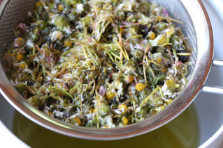 - Blüten sammeln, kurz in kaltem Wasser abspülen und locker auf einem Blech ausbreiten.