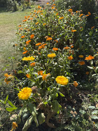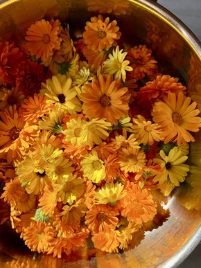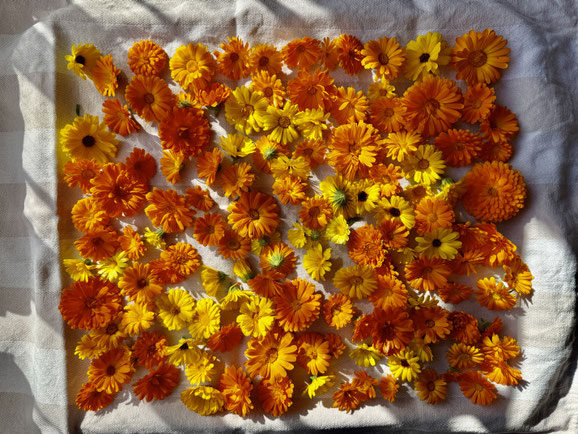 Da wir hier schon zwei schwache Nachtfröste hatten und für die nächste Woche Regen und Sturm angekündigt sind, nutze ich diesen sonnigen Oktobertag, um die letzten Blüten zu ernten. Bei mir im Garten ist das bereits der zweite Blütenschub: Die ersten habe ich für Bienen und Hummeln stehen lassen und nur hin und wieder welche gepflückt – für eine Tasse frischen Ringelblumentee oder als essbare Deko im sommerlichen Salat.